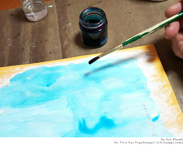 I started with some Colour Blast Colour Artist Ink, which I applied directly over the gesso, along with lots of water to help move it around before drying it off.