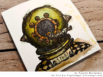 I cut my image and inked up the edges with a black marker. Then I decided where to place it on my index card. For more interest in the background I added some messy stamping with the "into the abyss" text stamp. As I wanted a stonger impression as I had with my first layer, I used my juicy Versafine Claire ink pad again and made multiple stamp impressions without reinking the stamp very often. With this technique I did two areas around the diving helmet and one in the right top corner.