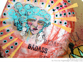 I started with a book I made from a single piece of kraft paper...it was pretty big at 30" x 24" so my pages in my book are about 7" x 6". Before I made the book I decorated the page with the NEW Dina Wakley gloss sprays that I got my grubby little hands on at Creativation. OH BOY!! Of course I also used Dina Wakley paints and a Stabilo Marks All Pencil.