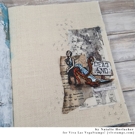 Next I stamped my two focal images. I colored the octopus lady with some ZIG real brush markers and cut her and the dead end sign out. I wasn't sure about which color to use for the sign, so I colored that after I decided where I wanted it to be on the page. To make the images blend nicely into the page I colored the cutting edges with a black marker.